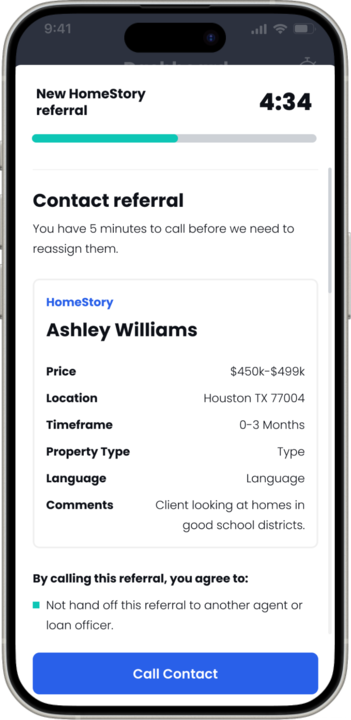 When connected, identify yourself as a HomeStory partner agent. The client will be expecting your call since they've already engaged with HomeStory, or their loan officer explained the program to them.